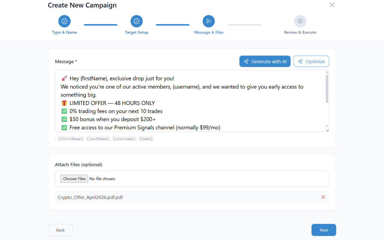 Write your message with personalization tags — {firstName}, {username}, or any custom CSV field. Attach a media file (image, video, PDF, voice note, document). Before sending, TeleSender previews the first 5 messages so you can sanity-check the substitutions. If the preview looks wrong, fix the template; the whole campaign never launches with broken placeholders.