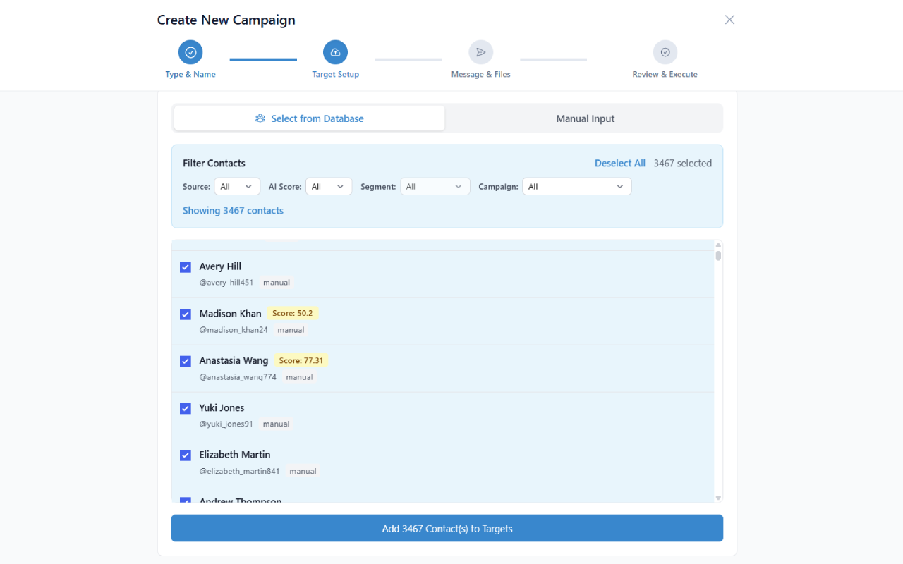 Choose a source in the Campaign Builder: upload a CSV, pull from a Telegram group or channel you've scraped, paste a list of usernames, or use a saved segment from your Contact Database. Deduplication runs automatically — the same phone or username never gets messaged twice in a campaign.