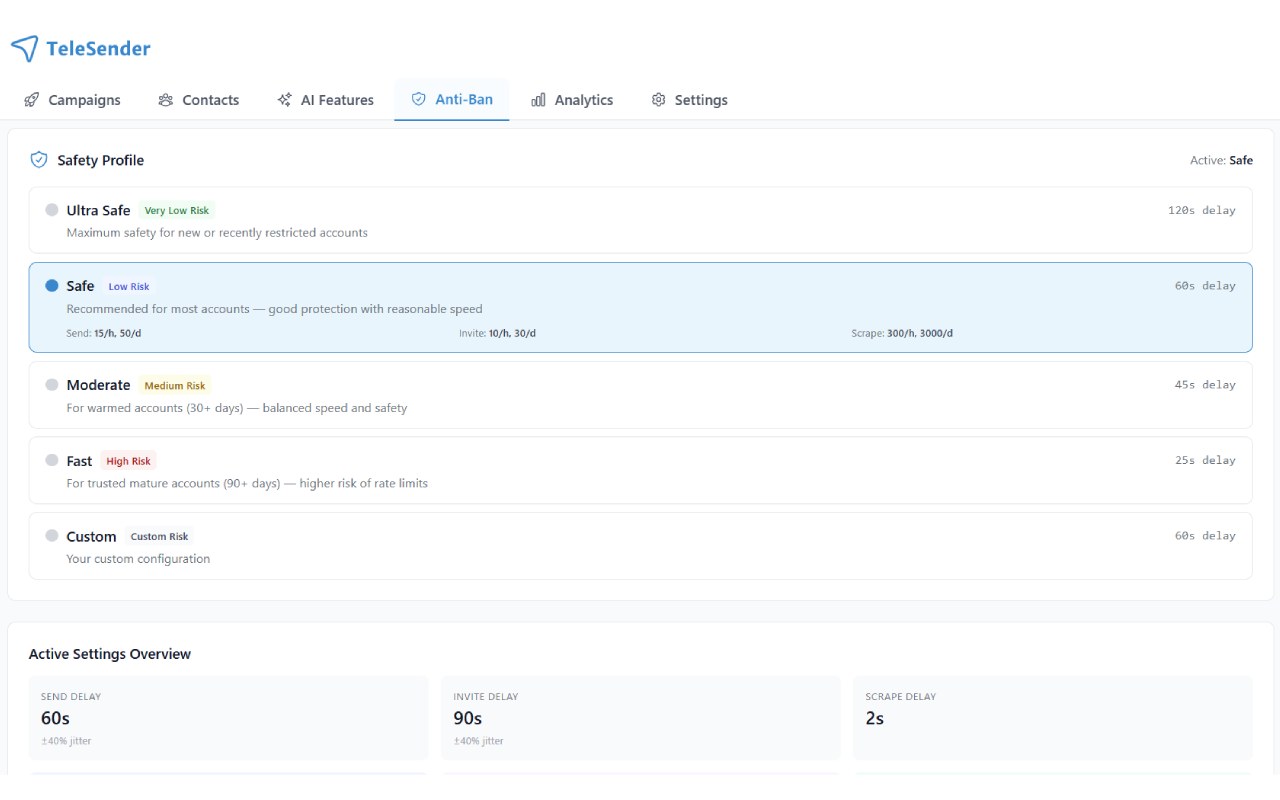 Select from Stealth, Safe, Balanced, Fast, or Aggressive. Each profile retunes all 12+ anti-ban mechanisms together — delays, session warming, human behavior simulation, error backoff windows. Stealth is the slowest (good for a fresh account); Aggressive is the fastest (fine for an account that's been running messages cleanly for 30+ days). You can change profiles mid-campaign — the next message respects the new settings.