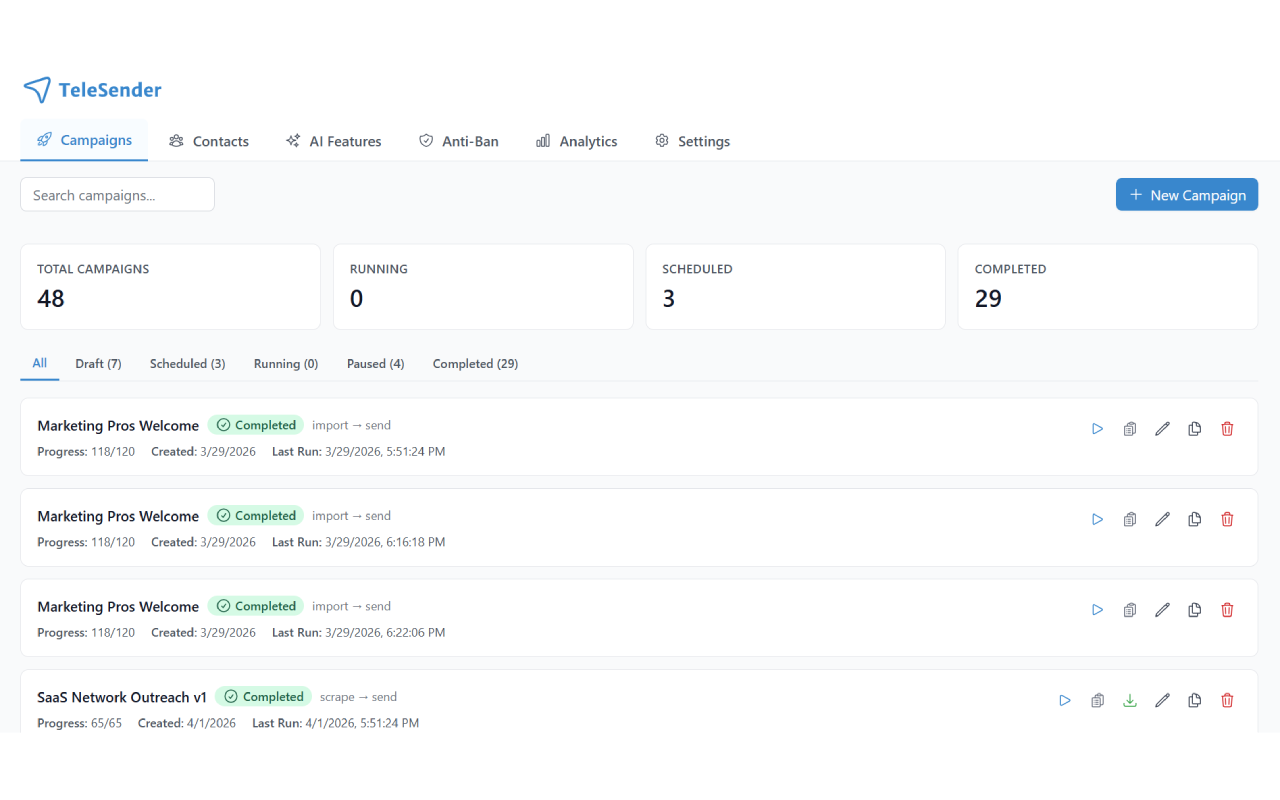 Pause, resume, duplicate, and re-run are all one-click buttons on every campaign. Duplicate is especially useful for A/B tests — clone a campaign, tweak one variable, run it against a fresh list.